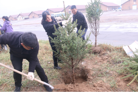 在園區(qū)內,大家興致勃勃,干勁十足,有的揮鍬挖坑、有的搬運樹苗、有的扶苗培土、有的提水澆灌,經(jīng)過3個小時的忙碌,100棵松柏昂然挺立,呈現(xiàn)出一派生機勃勃的景象。