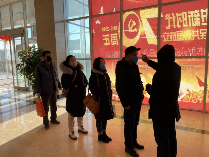 物產(chǎn)化工黨支部黨員堅(jiān)守防控工作一線,做好體溫測(cè)量和消毒工作。?
