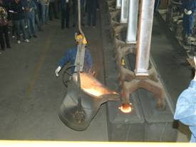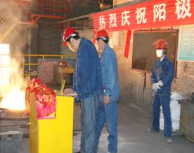 2012年7月7日上午11點零19分,青海物產(chǎn)工業(yè)投資有限公司10萬噸電解鋁/年升級改造項目,簡易陽極組裝車間大門前鞭炮齊鳴。青海物產(chǎn)工業(yè)投資有限公司黨總支副書記、青海長春炭素有限公司總經(jīng)理王松華,公司常務副總經(jīng)理、項目副總指揮常海寧,工業(yè)投資和長春炭素公司副總經(jīng)理姜紅萍,公司副總經(jīng)理張秉瑜,總經(jīng)理助理范登福等公司領(lǐng)導和各車間、部室的職工出席了簡單的點火澆鑄儀式。王松華同志按下了點火按鈕鄭重宣布澆鑄正式開始。當中頻爐工將第一爐鐵水倒入抬包時,標志著新陽極組裝車間正式投產(chǎn)運行。